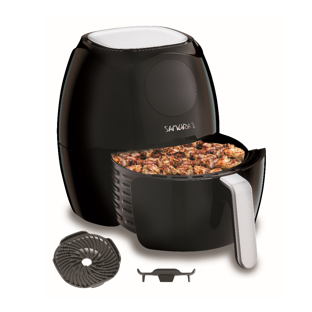 מכשיר מהפכני לצלייה וטיגון בריא באוויר חם | טכנולוגית RAPID AIR CIRCULATION שמשלבת סירקולציית אויר חם לקבלת תוצאה זהובה ופריכה | סל עם ציפוי טפלון בקיבולת 3 ליטרים עם רשת נשלפת לטיגון באוויר החם | פלטת גריל מיציקת אלומיניום לצליית נתחי בשר, עוף ודגים הספק1350w