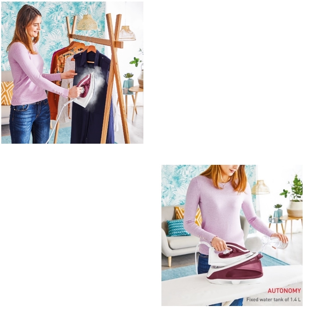 מגהץ קיטור איכותי מבית המותג הצרפתי Tefal, עם מיכל מים גדול במיוחד של 1.4 ליטר, שניתן למילוי תוך כדי הגיהוץ.