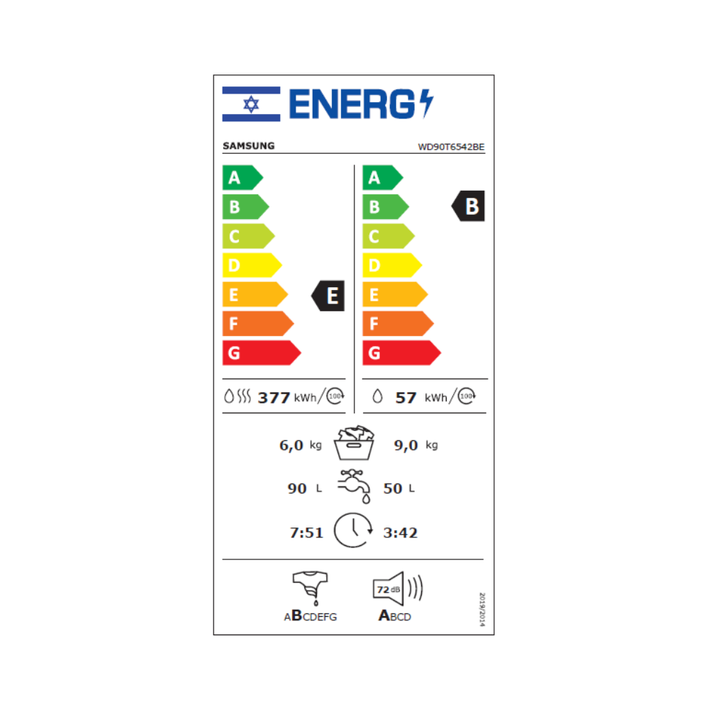מכונת כביסה 9 ק"ג משולבת מייבש כביסה 6 ק"ג WD90T6542BE