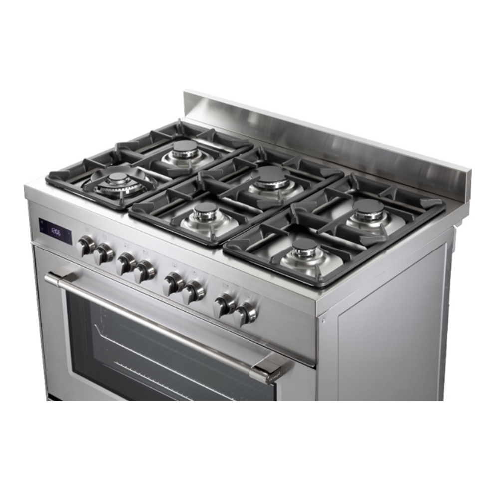 6 להבות גז בגדלים שונים | נושא סירים חצובות ברזל | תא אפיה גדול בנפח 87 ליטר | דלת פנימית נשלפת לניקוי קל